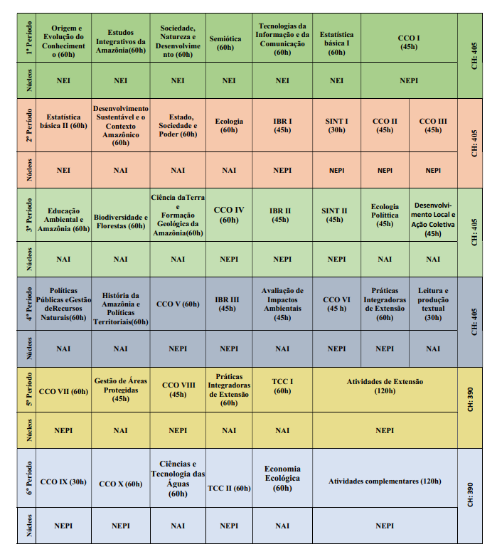 A matriz curricular do Bacharelado Interdisciplinar em Ciências Ambientais – Ufopa está distribuído em 6 (seis) semestres: